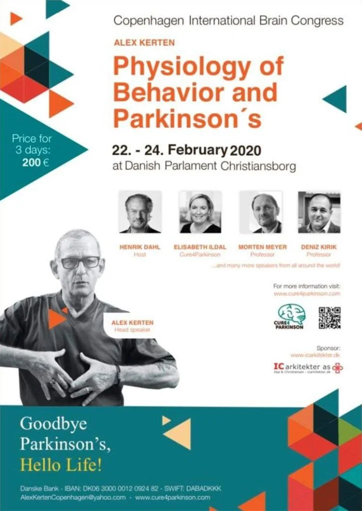 ALEX KERTEN: Specialista in fisiologia del comportamento, arti marziali, scrittore e amante della musica. Vanta molti anni di esperienza nel campo del movimento e dei disturbi respiratori e posturali. Ha sviluppato il metodo Gyro-Kinetics, con il quale ha trattato molte persone con Parkinson. Il suo metodo fonde arti marziali, movimenti strutturati e musica. È autore di libri sul Parkinson tradotti in varie lingue, tra cui “Goodbye Parkinson, Hello Life!”.