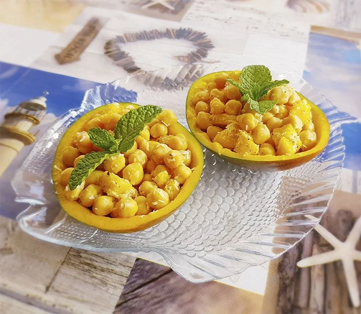 - Impiatta: Distribuisci l’insalata nelle due “ciotole” ricavate dalla buccia del mango e decora a tuo piacimento.
