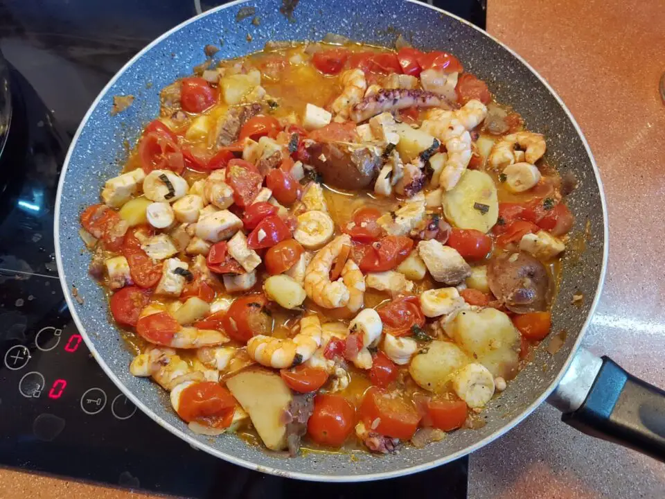Quando le patate saranno quasi cotte e tenere, aggiungete i gamberi sgusciati, il polpo tagliato a rondelle e il pesce spada crudo tagliato a cubetti. Aggiungete pepe nero macinato, menta e scorza di limone grattugiata a piacere.