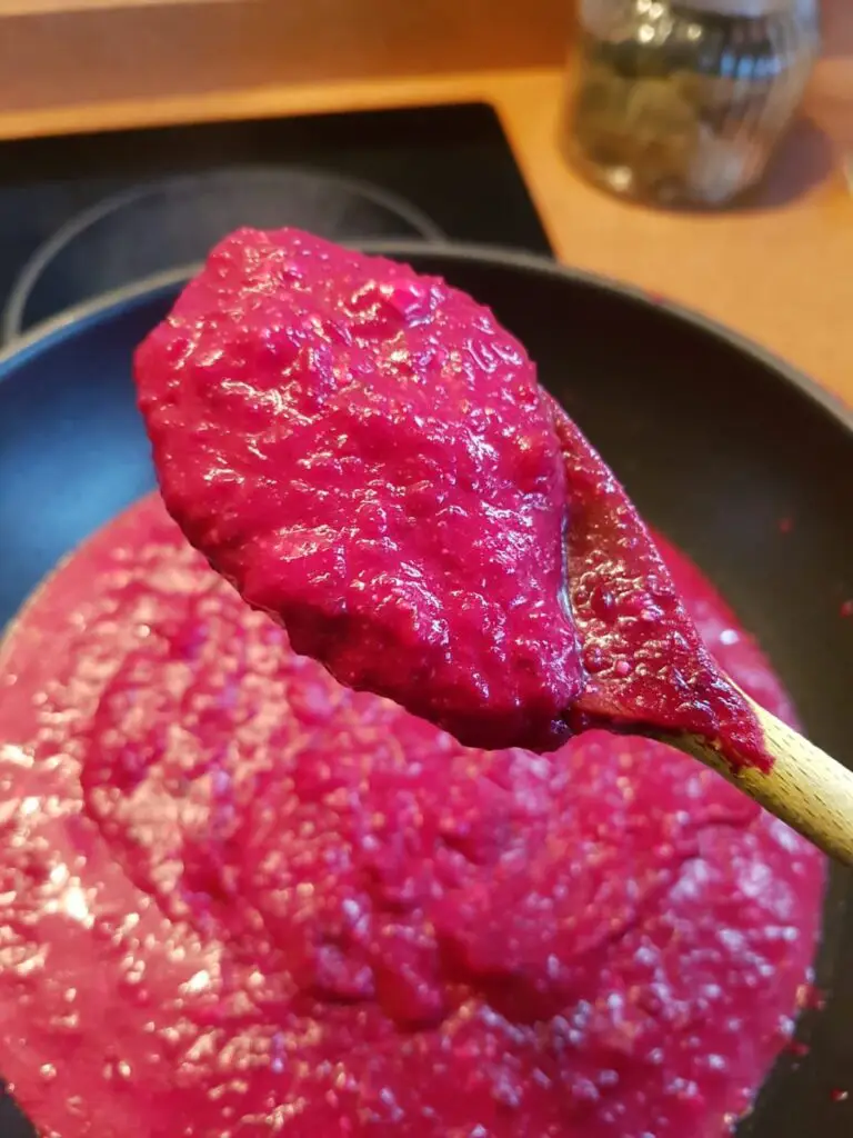 - La magia del colore: Spremi il succo di un limone. Aggiungilo gradualmente alla salsa mescolando bene.Nota: Man mano che aggiungi il limone, il colore della salsa cambierà (diventando più acceso e violaceo). Decidi tu quanto succo mettere in base alla sfumatura di colore che preferisci!